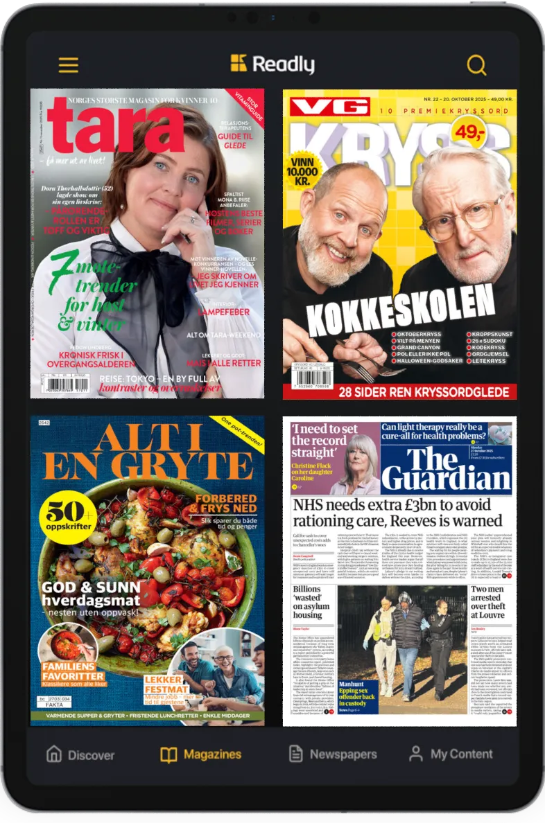 Tilbudet «Få Prøv gratis i 2 måneder gratis» gjelder kun for nye Readly-kunder og kan bare aktiveres én (1) gang per kunde. Tilbudet kan ikke kombineres med et aktivt Readly-abonnement eller andre tilbud. Etter Prøv gratis i 2 måneder blir du belastet for et standardabonnement med månedlig fornyelse på 199,00 kr/måned. Abonnementet fornyes automatisk og kan sies opp når som helst på Readlys nettside.
